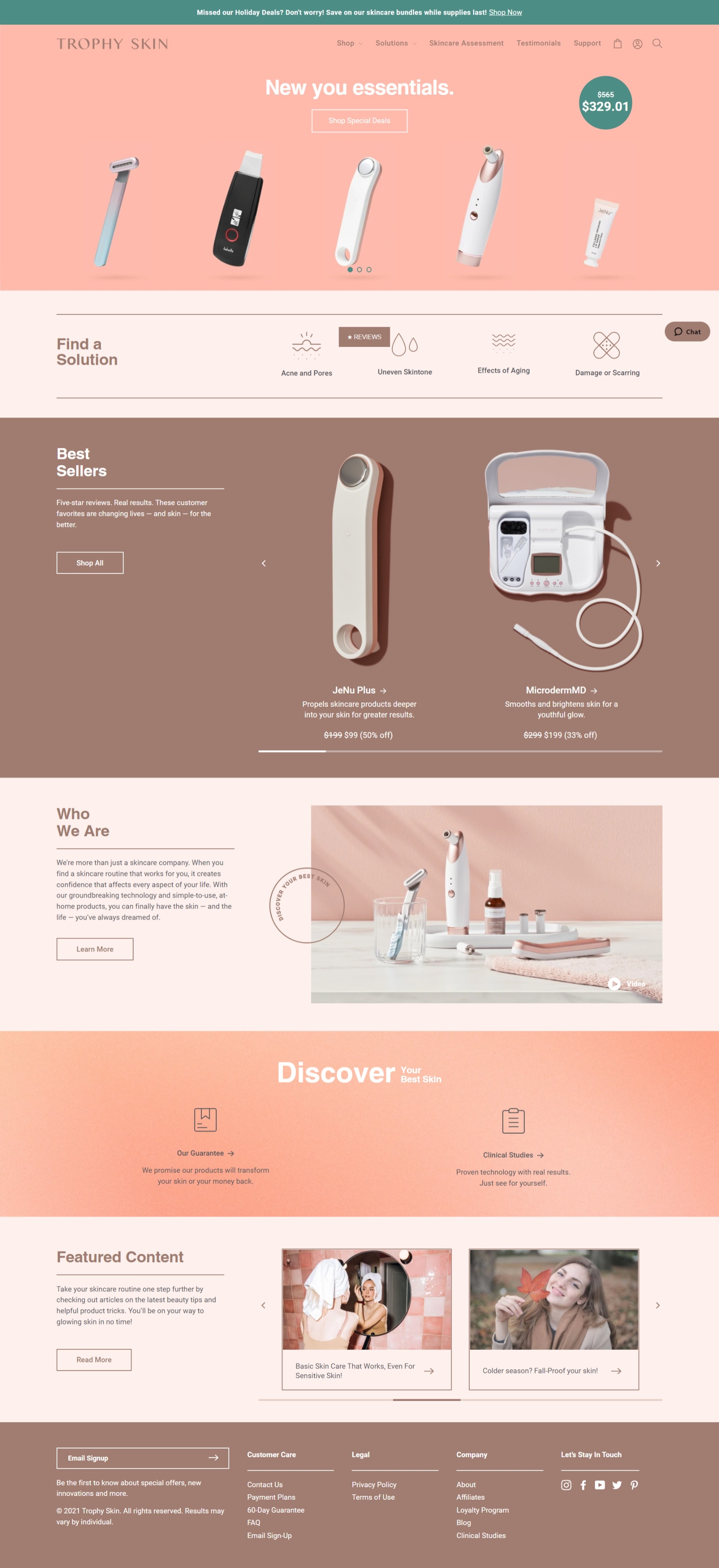 Trophy skin is a small skincare company that sells high tech beauty products. They provide users with information to make well-informed decisions about skin products. Trophy skin wanted to utilize metafields to represent more data for the products. I helped modify their existing theme to reflect Accentuate’s new layout feature to represent more data for existing products. I also helped modify the header to reflect some new design changes.