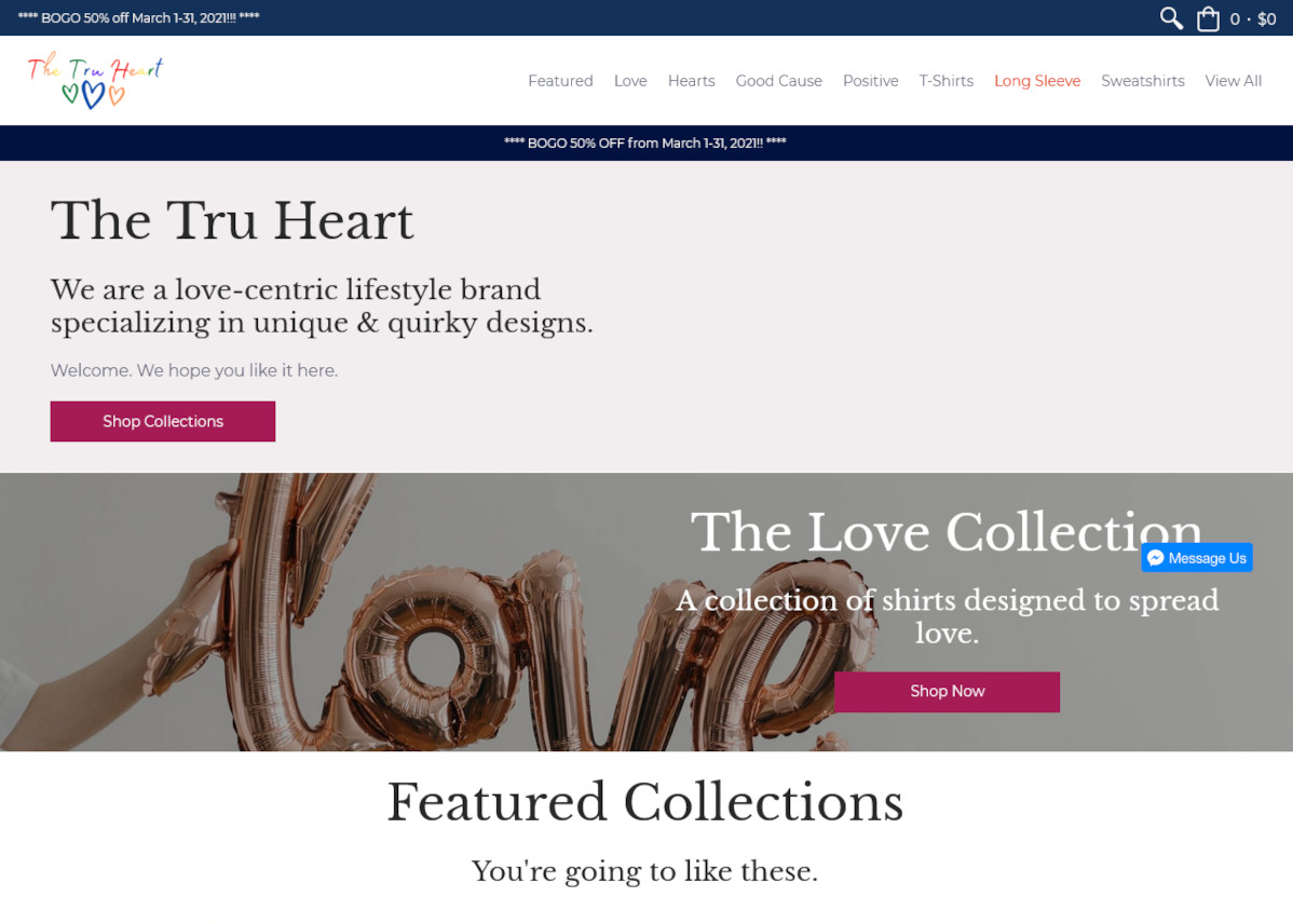 Tru Heart, is a lifestyle brand that creates shirts with unique designs. I was tasked with setting up their purchased theme to address the concerns of the business. The owner of Tru Heart reached out to me to set up her new theme for her Shopify store with (1) a means of showing announcements (2) updating sections with content and high quality images.
